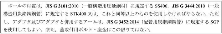 本規格によれば、ポールの材質については下記のとおり定められています。