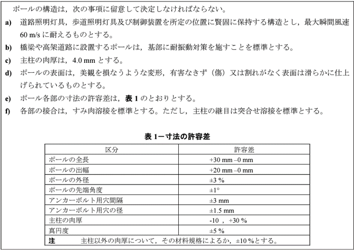 本規格によれば、ポールの構造については下記のとおり定められています。